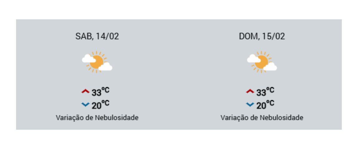 As temperaturas mínimas estão previstas em torno de 20°C, e as máximas ficam em torno de 33°C, e a sensação térmica pode ser superior a isso. Recomenda-se atenção redobrada quanto aos cuidados com a hidratação regular e abundante e a exposição aos raios solares.